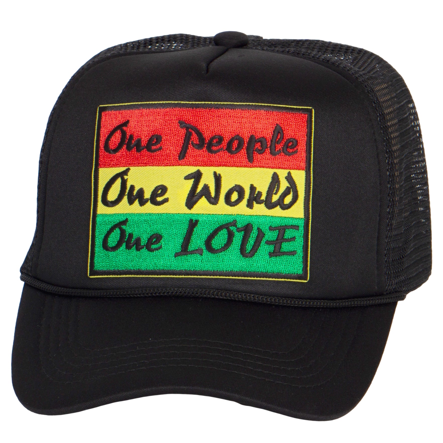 - Bold Embroidered Message: Featuring the powerful words "One People, One World, One Love," this hat spreads a message of unity and peace. The vibrant red, yellow, and green design pops against the black background for maximum impact.